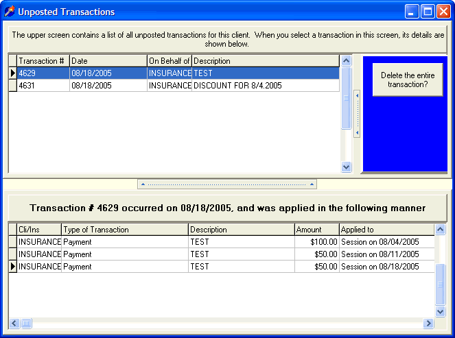 This screen is divided into two areas. The upper section contains a description of each transaction (payment or adjustment) that has been applied to this account but that has not yet been posted (See End of Day). The lower screen contains a list of how the transaction selected in the upper screen was applied against one or more sessions. In the above example, the first transaction (#4629 on 8/18/2005) highlighted in the upper screen was a payment that was distributed across 3 different sessions displayed in the lower screen.